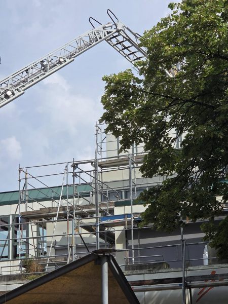 Während die Feuerwehr die betroffene Fassade öffnete und gezielt ablöschte, übernahm das Deutsche Rote Kreuz die Absicherung der eingesetzten Kräfte. Die Zusammenarbeit aller Beteiligten verlief reibungslos und professionell.